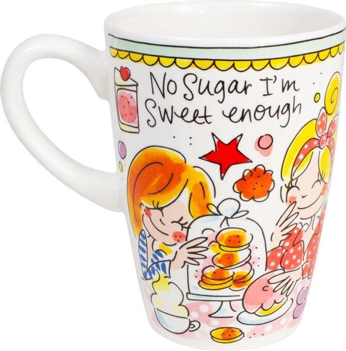 Deze grote Blond Amsterdam XL beker is onderdeel van de welbekende Even Bijkletsen serie en heeft een inhoud van 500 ml. De rand van de beker heeft een mint kleur, wat onderdeel is van deze vernieuwde lijn. De mok staat vol met herkenbare en vrolijke illustraties en aan de binnenkant staat een roze ster. De aardewerk beker is perfect voor groot glas thee of warme chocolademelk met slagroom. Ontdek de rest van het vrolijke Blond Amsterdam servies en alle andere koppen en mokken in onze webshop.