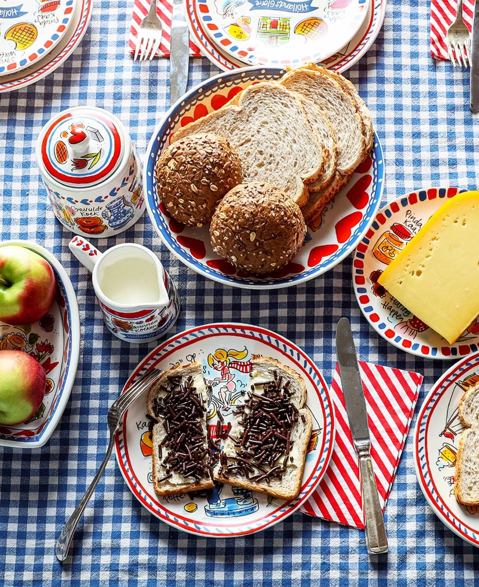 We love Holland! De nieuwe Hollands Glorie lijn van Blond Amsterdam is vormgegeven in frisse rood/wit/blauwe tinten en voorzien van typisch Hollandse illustraties. Op deze xl beker staan o.a. illustraties van klompen, een koe en bakfiets.