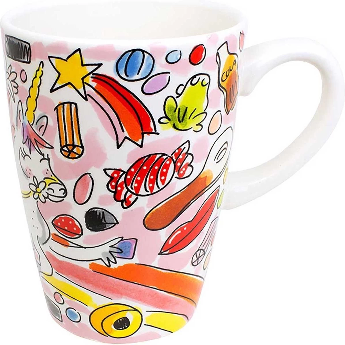 Made with magic! Deze heerlijk grote beker van Blond Amsterdam staat vol met vrolijke regenboogkleuren. Op de beker staat een meisje met een unicorn afgebeeld omringd door snoep.