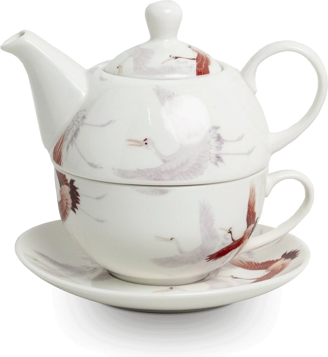 Merkloos Tea For One Theepot, Koffiepot 400 Ml Met Kop En Schotel Kraanvogel In Mooie Cadeau Verpakking. Cadeau Voor Vriendin.