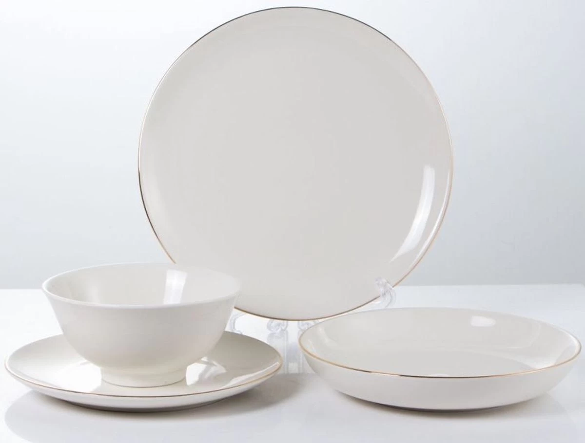 Eet samen met je gezin en gasten in stijl met deze bijzonder en uniek 6 persoons serviesset. Een prachtige complete set in Bright White met gouden randen. Deze set straalt luxe uit en past in veel interieurs.